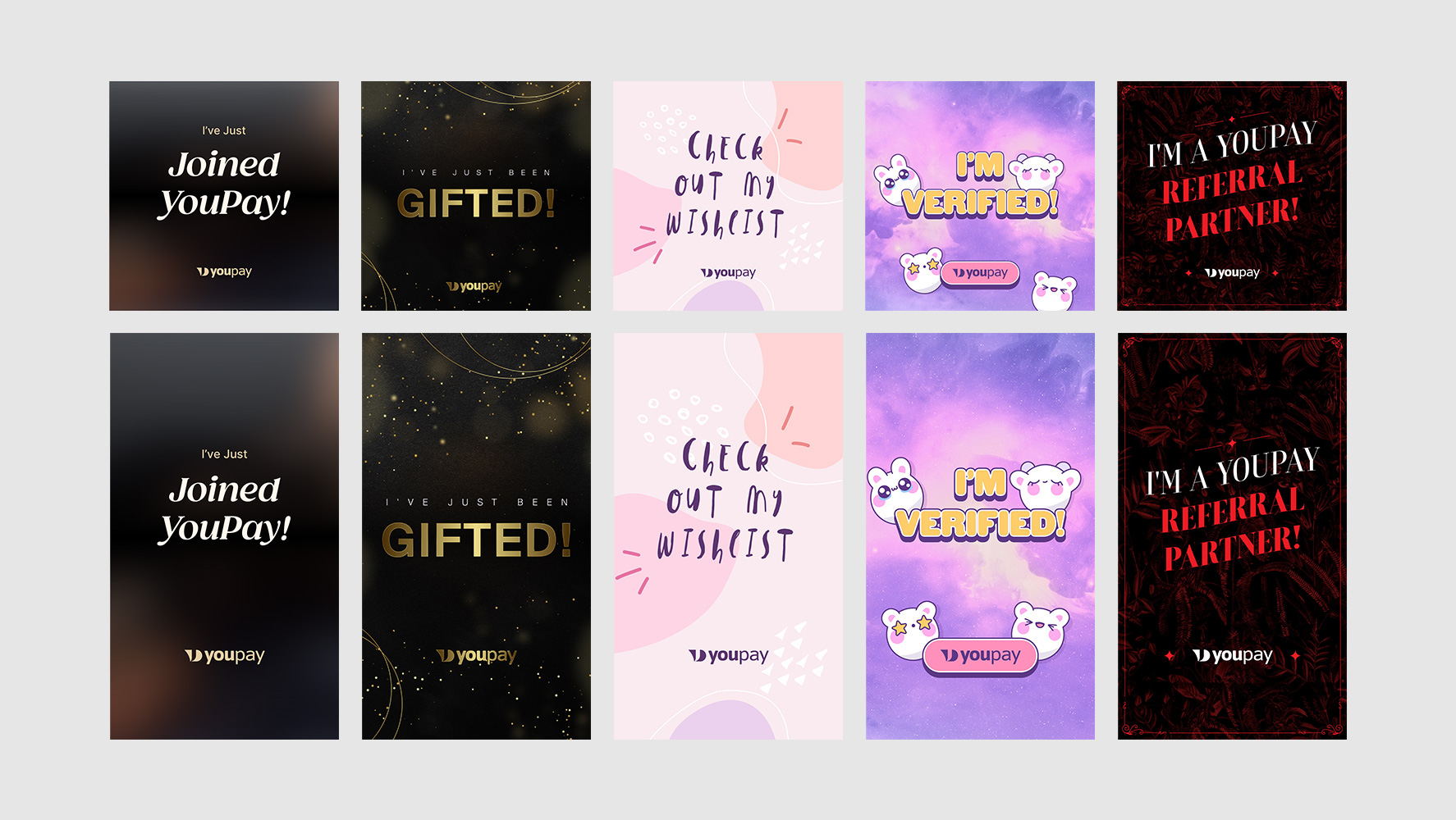We've created a variety of different styled social post assets for the YouPay Referral Program that you can use to broadcast the fact that you're a proud member of the program. Download a zip file or click on the PDF link to see everything on one page.